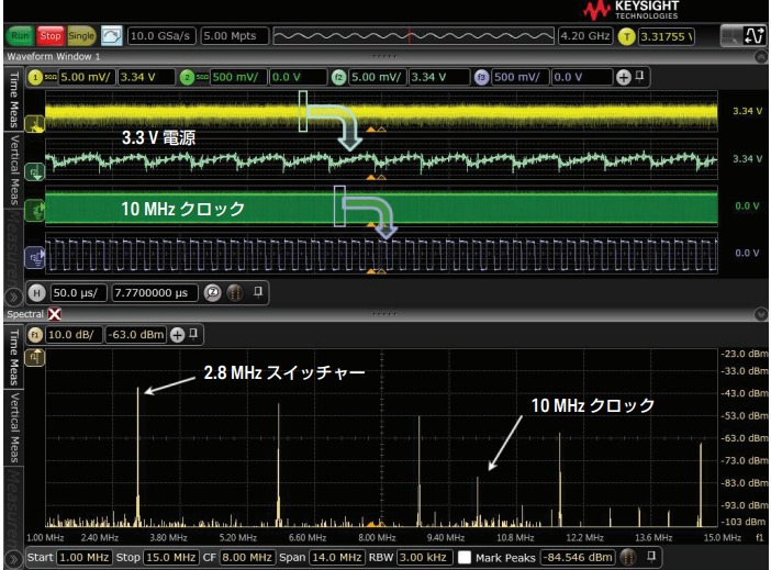 InfiniiumのFFT機能を使って10MHzクロック、125MHzクロック、2.8MHzスイッチング周波数の影響を解析。ここでのポイントは10MHzと125MHzを同じFFTで観測することは難しい、という点。